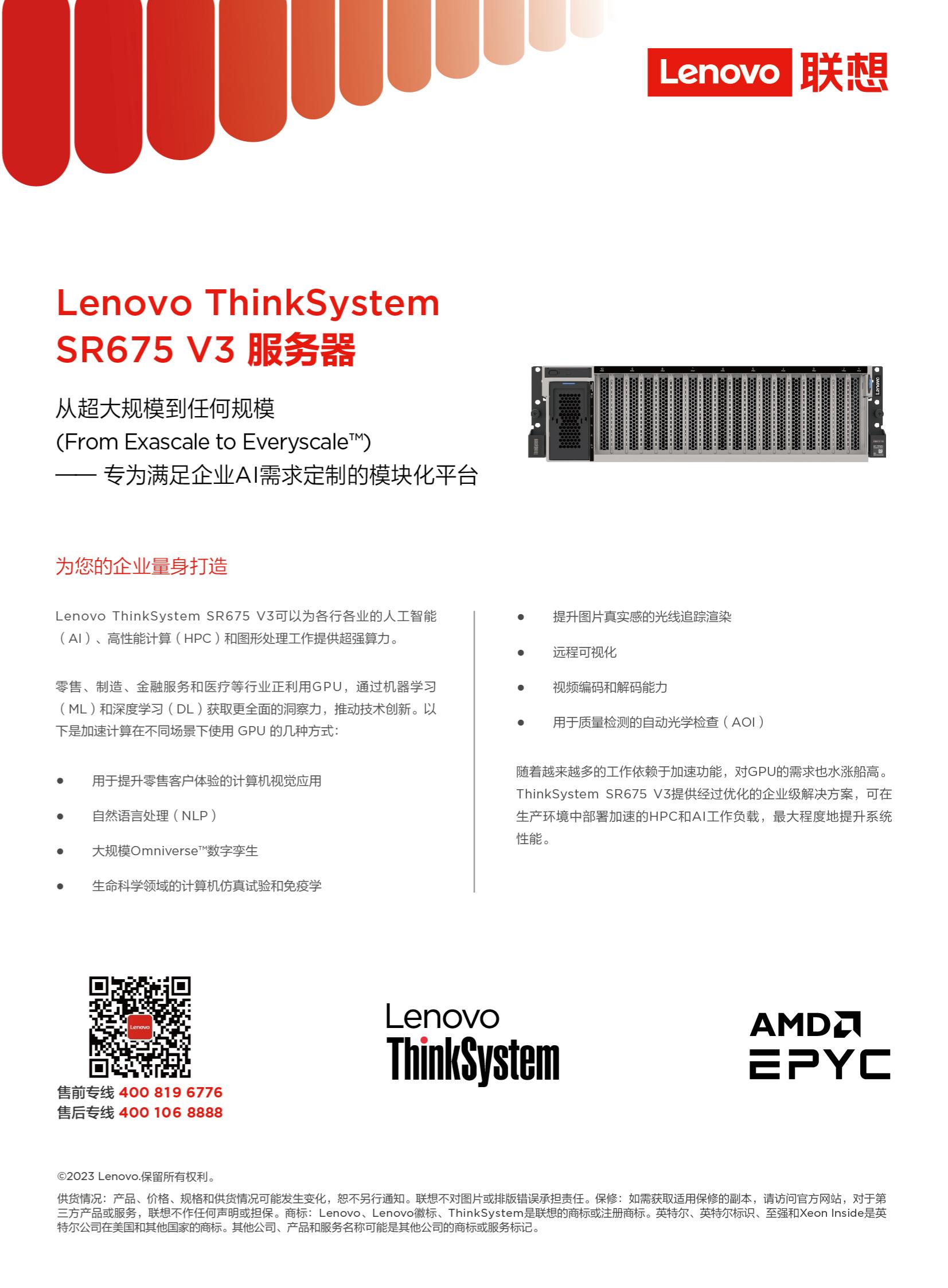 Lenovo ThinkSystem SR675 V3可以为各行各业的人工智能(AI)、高性能计算(HPC)和图形处理工作提供超强算力。