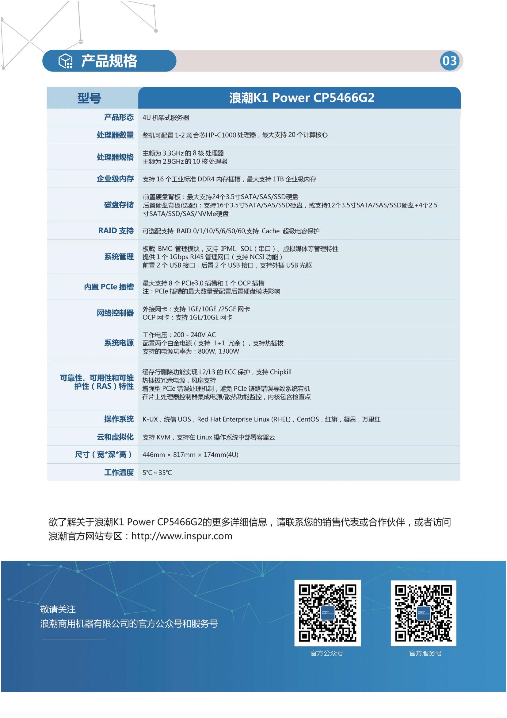 2. 浪潮K1 Power CP5466G2为4U2路国产高性能存储服务器,是面向新数据时代的海量视频、影像、音频、文档、报表等非结构化数据存储的专属平台。广泛应用于云计算、大数据、高性能计算、人工智能等应用场景。
