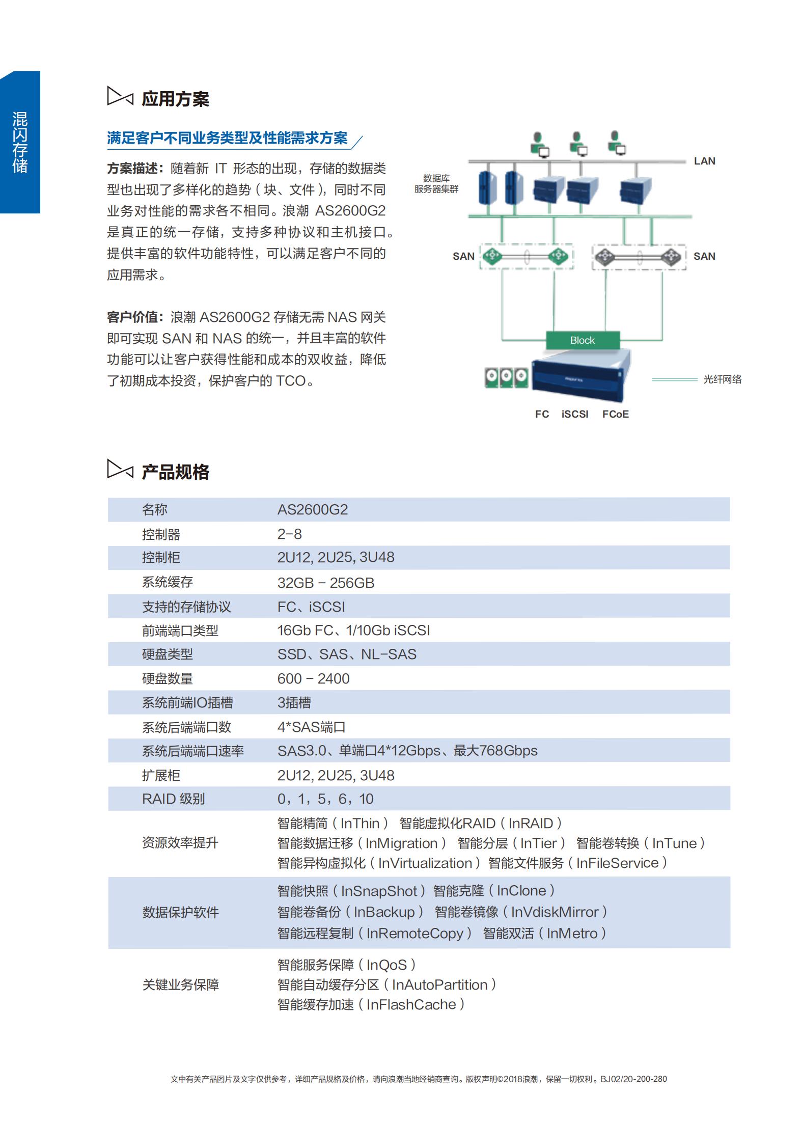浪潮AS2600G2是第二代入门融合活性存储系统,专门为结构化和非结构化的中小型企业级环境设计。AS2600G2可提供可伸缩的3PB容量、同时提供Block和Files服务、支持16Gb FC和1/10Gb iSCSI主机接口,是一款集高可靠和高性能于一体的统一存储系统,性能完全满足OLTP和OLAP、虚拟化和文件共享等的需求 。另外,AS2600G2具有灵活丰富的软件功能,充分满足中小企业的数据中心容灾、备份等需求。