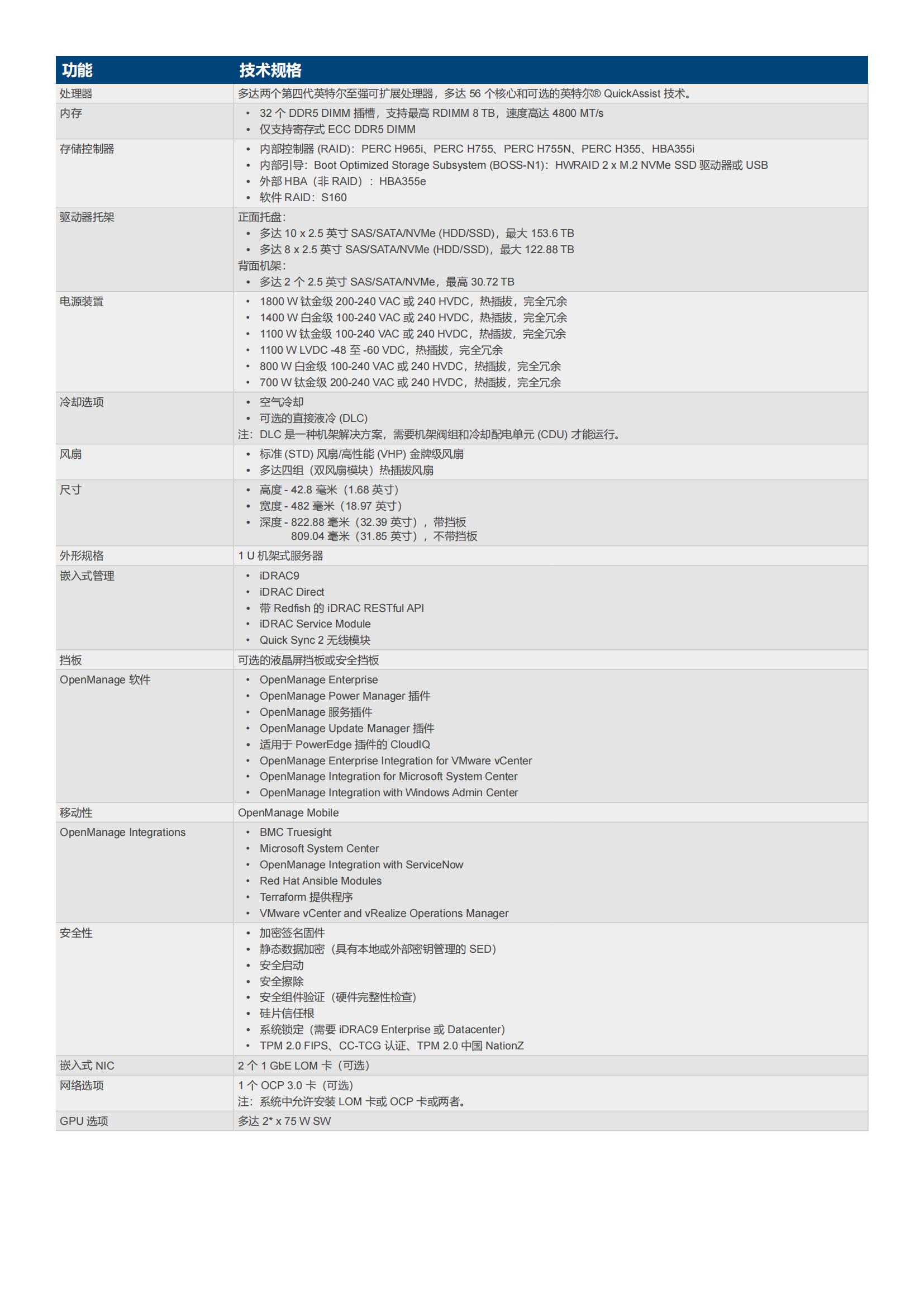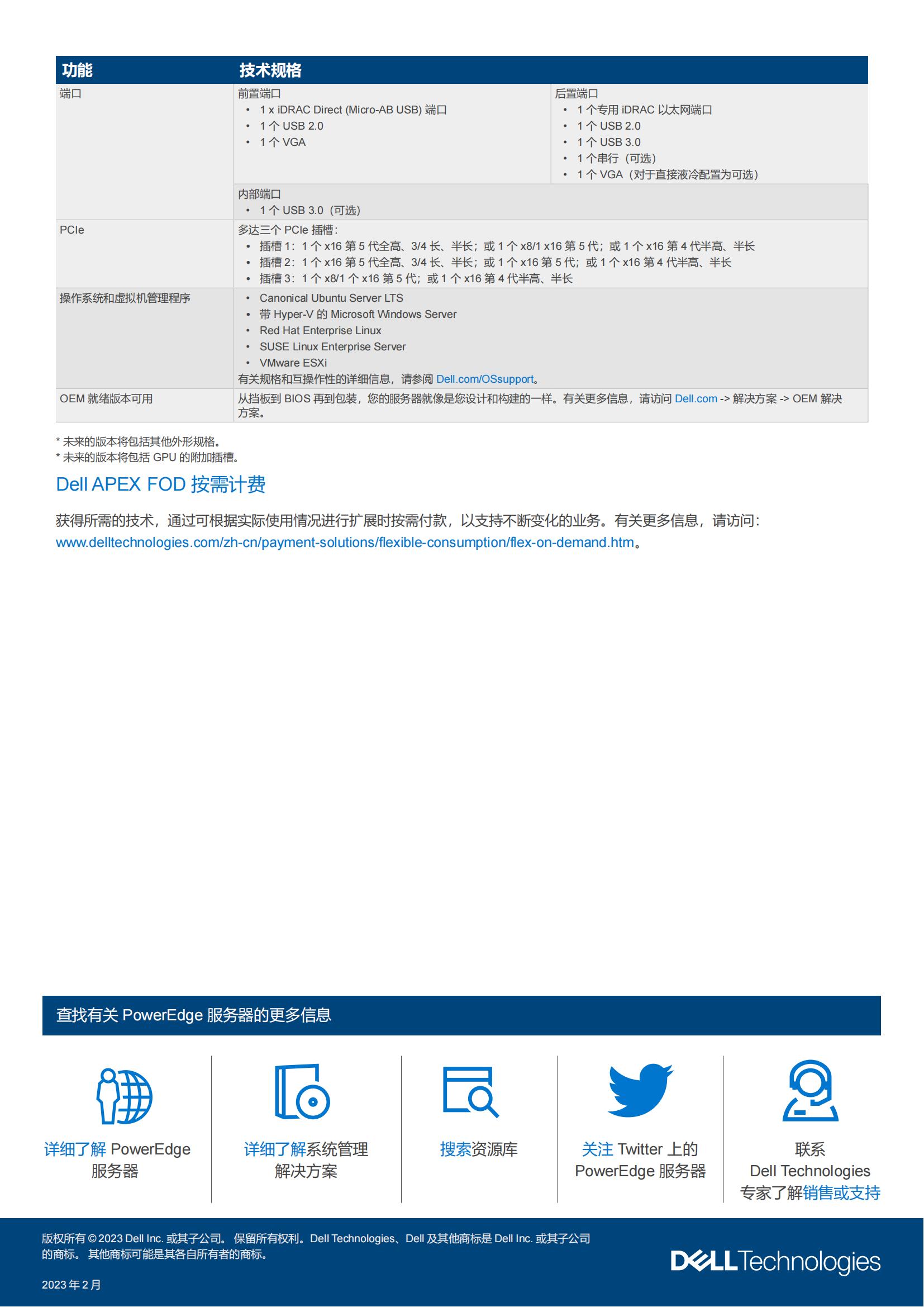 • 存储选项包括多达 8 个 2.5" NVMe/SAS4/SATA,以及多达 10 个 2.5" NVMe/SAS4/SATA、14/16 个 NVME E3.S第 5 代*。