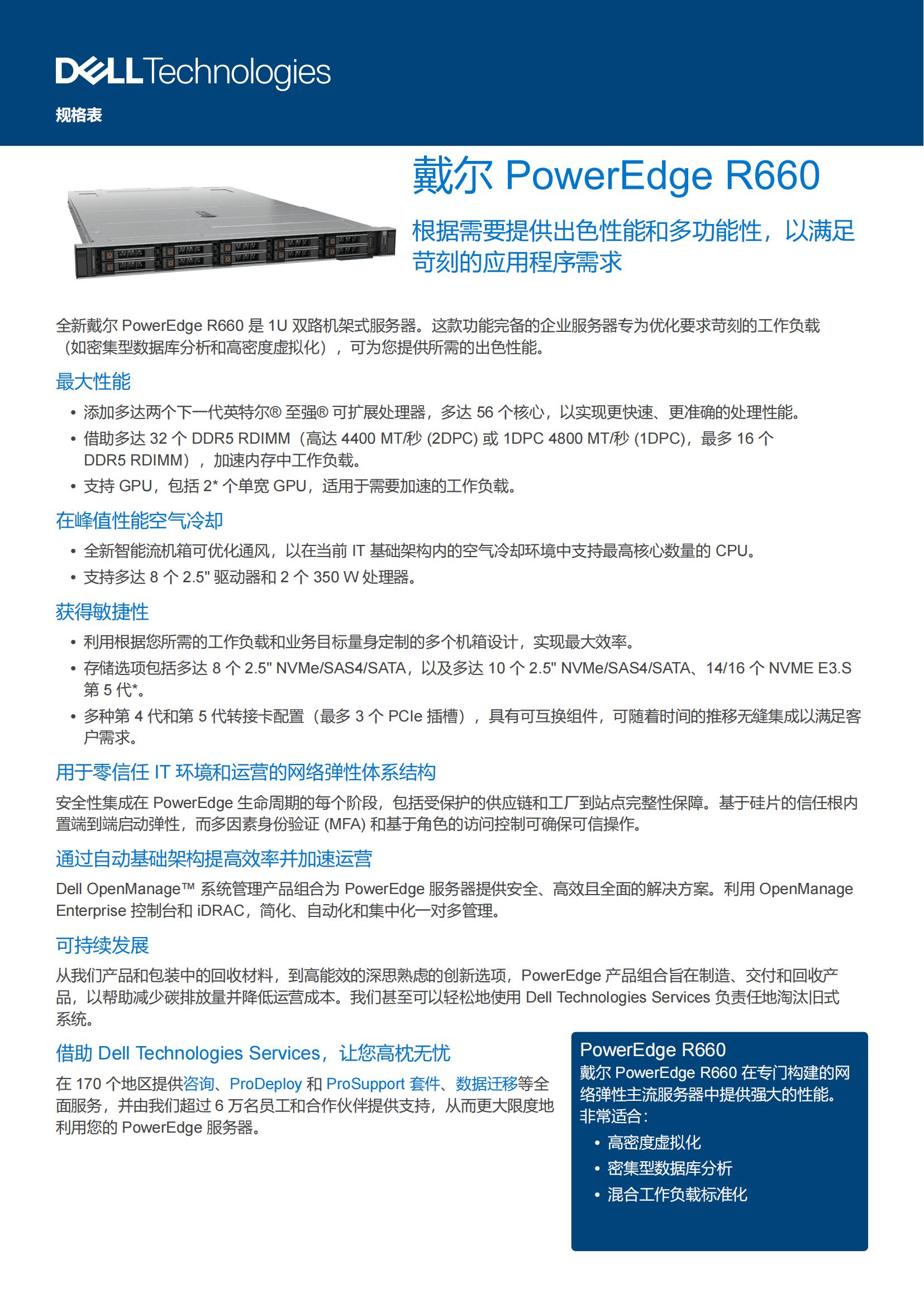 全新戴尔 PowerEdge R660 是 1U 双路机架式服务器。这款功能完备的企业服务器专为优化要求苛刻的工作负载(如密集型数据库分析和高密度虚拟化),可为您提供所需的出色性能。