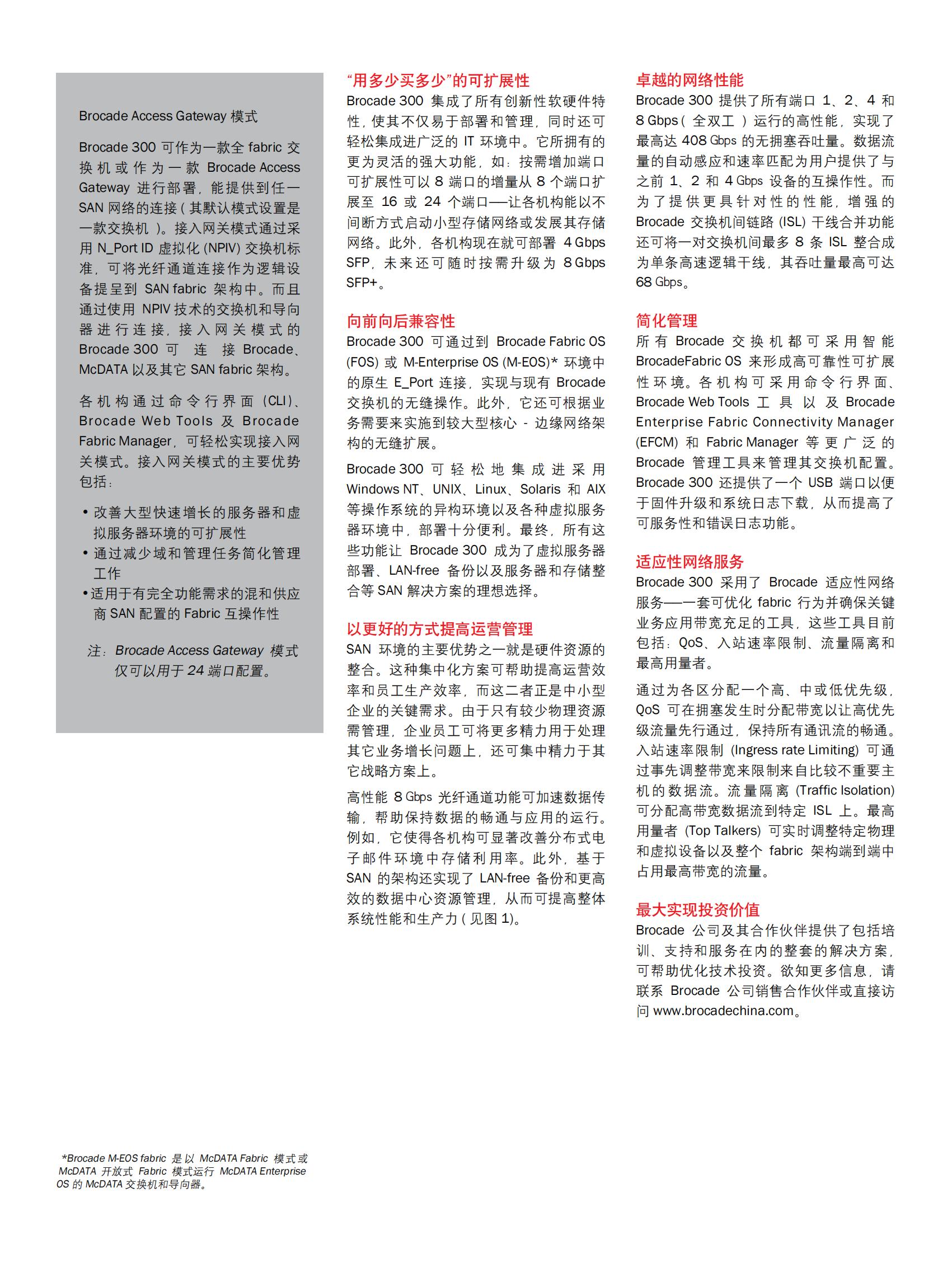 提供了双重功能,可作为一款全 fabricSAN 交换机或作为一款采用 NPIV 技术的Brocade Access Gateway 来 使 用,可 增强 fabric 架构可扩展性并简化管理