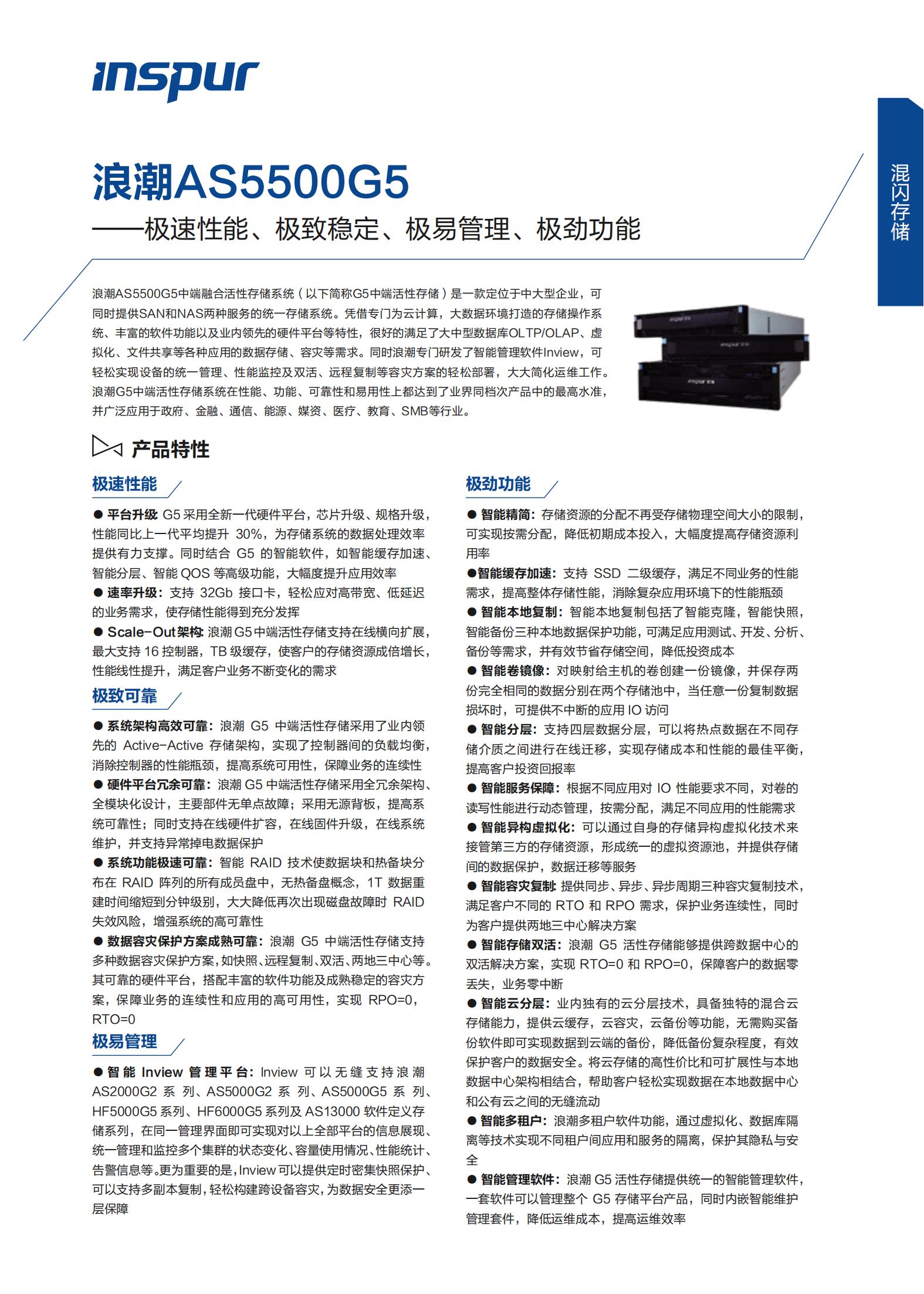 浪潮AS5500G5中端融合活性存储系统(以下简称G5中端活性存储)是一款定位于中大型企业,可同时提供SAN和NAS两种服务的统一存储系统。凭借专门为云计算,大数据环境打造的存储操作系统、丰富的软件功能以及业内领先的硬件平台等特性,很好的满足了大中型数据库OLTP/OLAP、虚拟化、文件共享等各种应用的数据存储、容灾等需求。同时浪潮专门研发了智能管理软件Inview,可轻松实现设备的统一管理、性能监控及双活、远程复制等容灾方案的轻松部署,大大简化运维工作。浪潮G5中端活性存储系统在性能、功能、可靠性和易用性上都达到了业界同档次产品中的最高水准,并广泛应用于政府、金融、通信、能源、媒资、医疗、教育、SMB等行业。