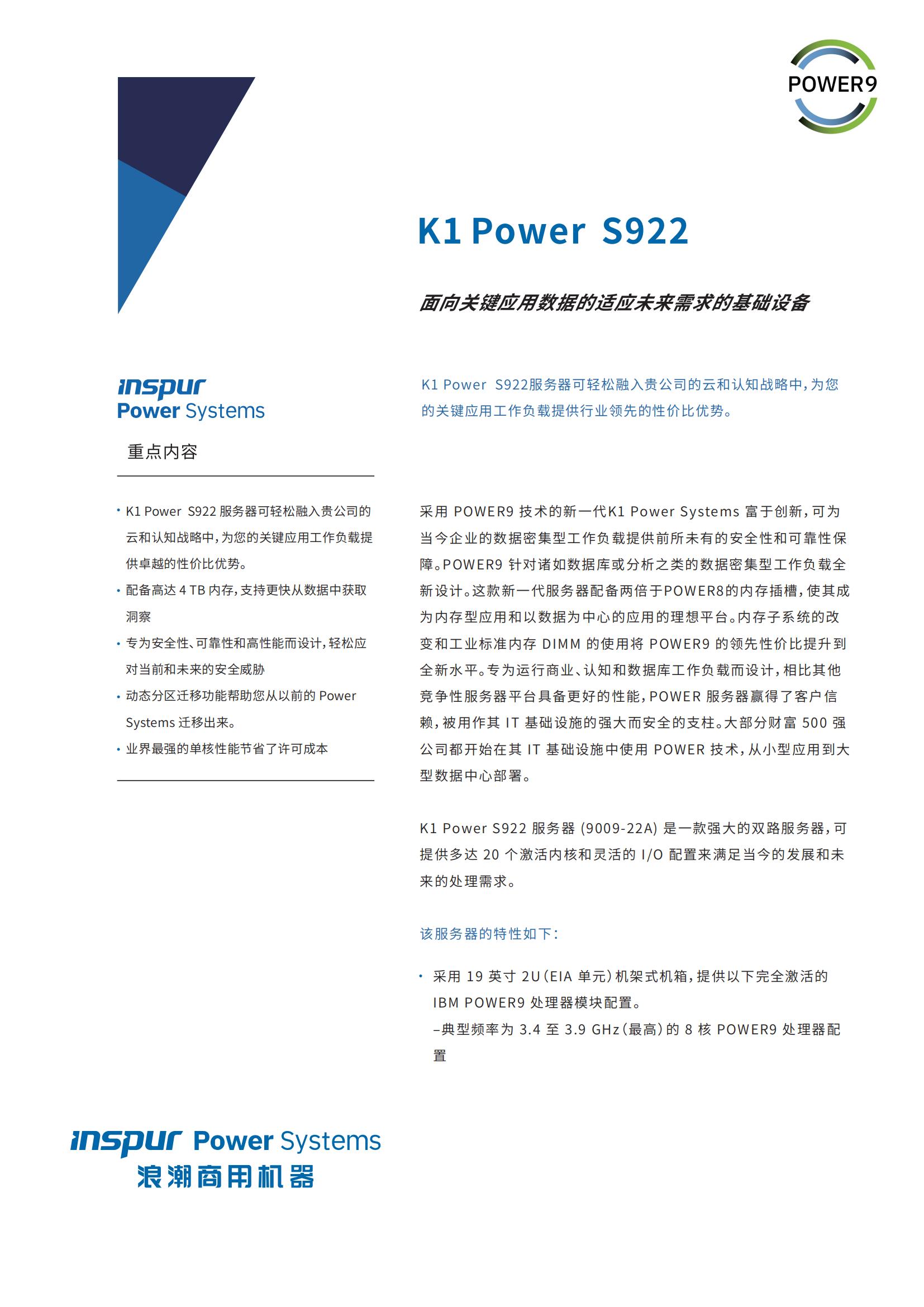 1. K1 Power S922 服务器可轻松融入贵公司的云和认知战略中,为您的关键应用工作负载提供卓越的性价比优势。
