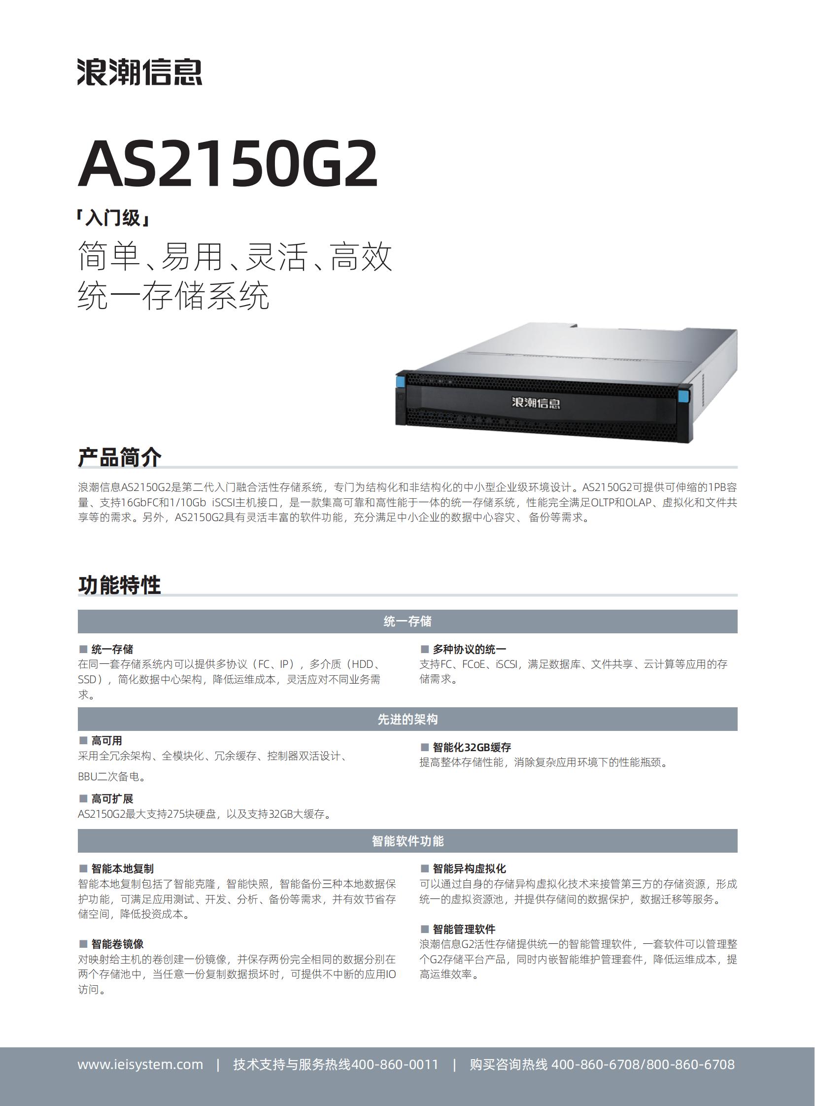 浪潮信息AS2150G2是第二代入门融合活性存储系统,专门为结构化和非结构化的中小型企业级环境设计。AS2150G2可提供可伸缩的1PB容量、支持16GbFC和1/10Gb iSCSI主机接口,是一款集高可靠和高性能于一体的统一存储系统,性能完全满足OLTP和OLAP、虚拟化和文件共享等的需求。另外,AS2150G2具有灵活丰富的软件功能,充分满足中小企业的数据中心容灾、 备份等需求。