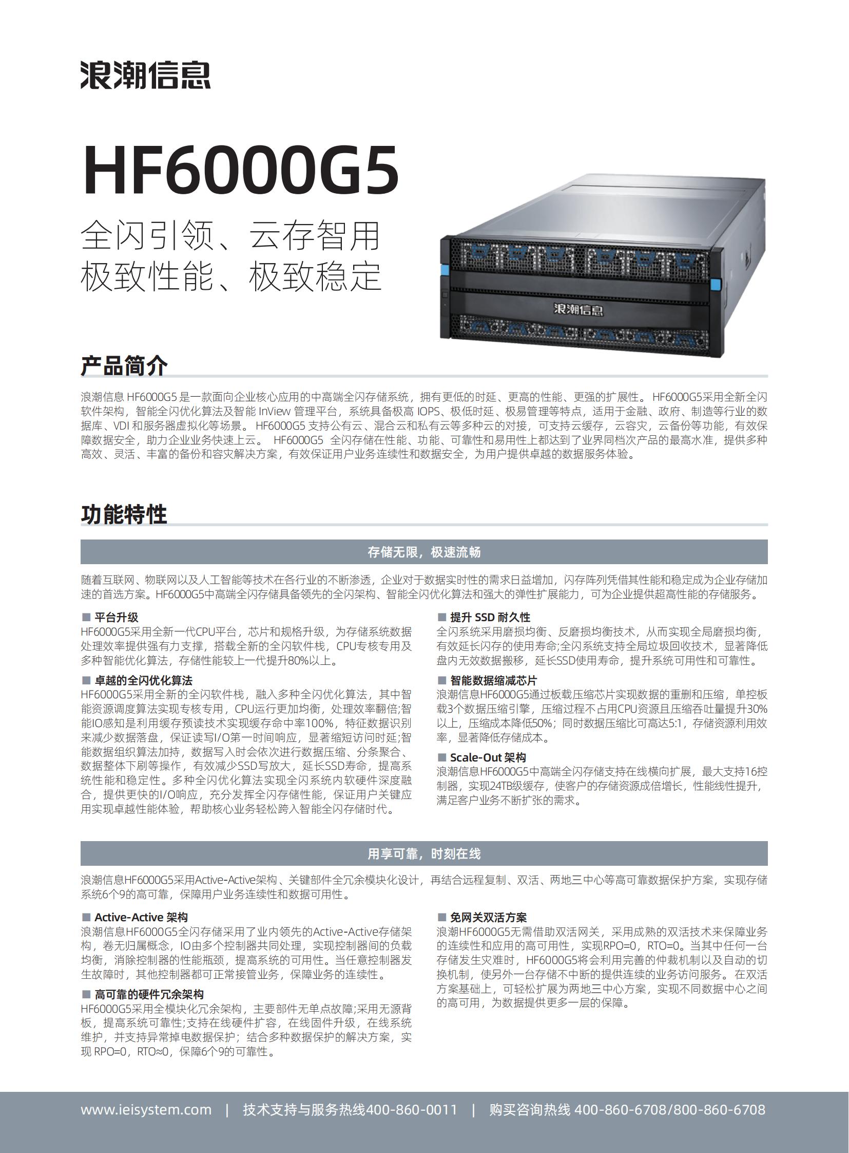 浪潮信息 HF6000G5 是一款面向企业核心应用的中高端全闪存储系统,拥有更低的时延、更高的性能、更强的扩展性。