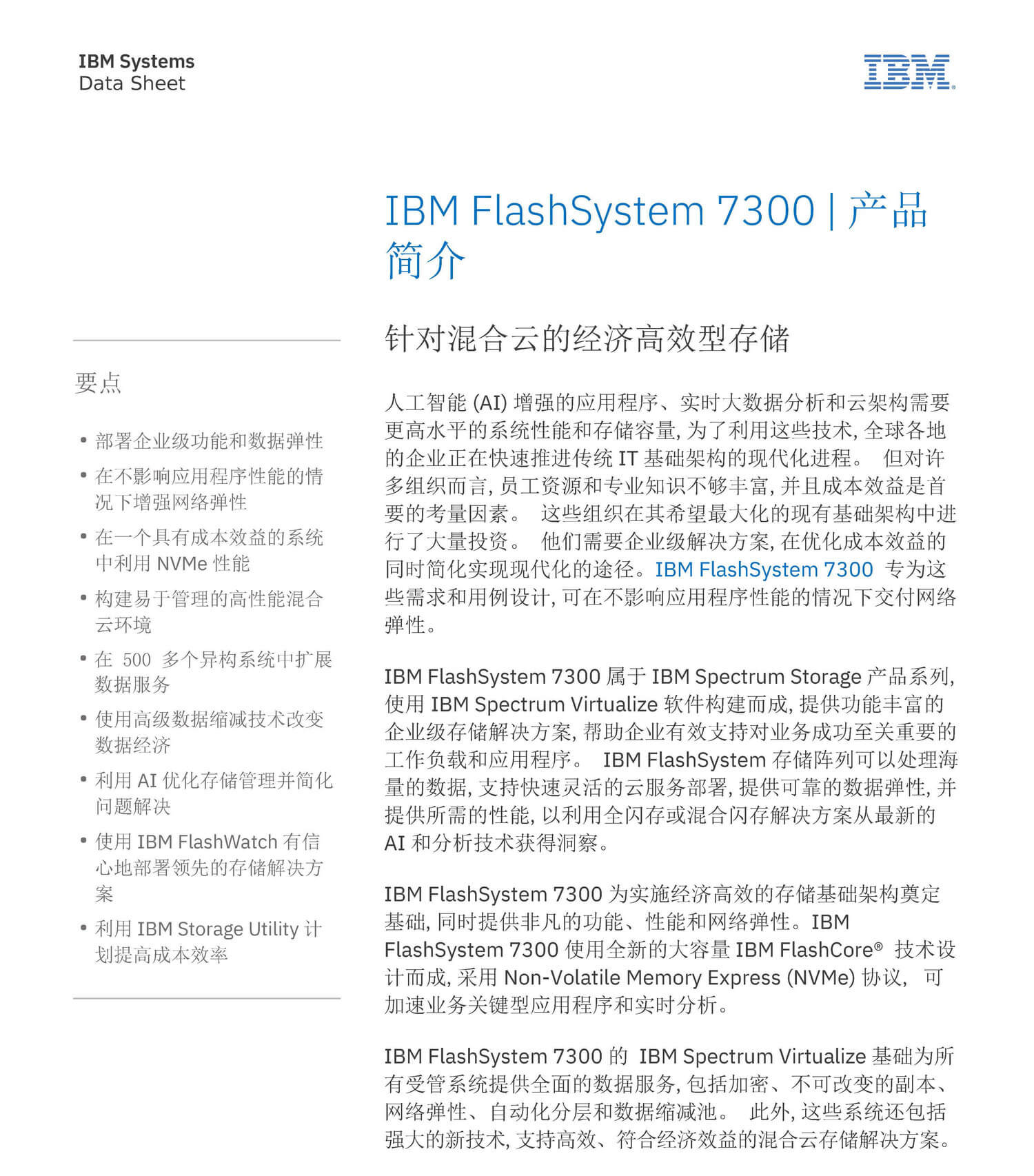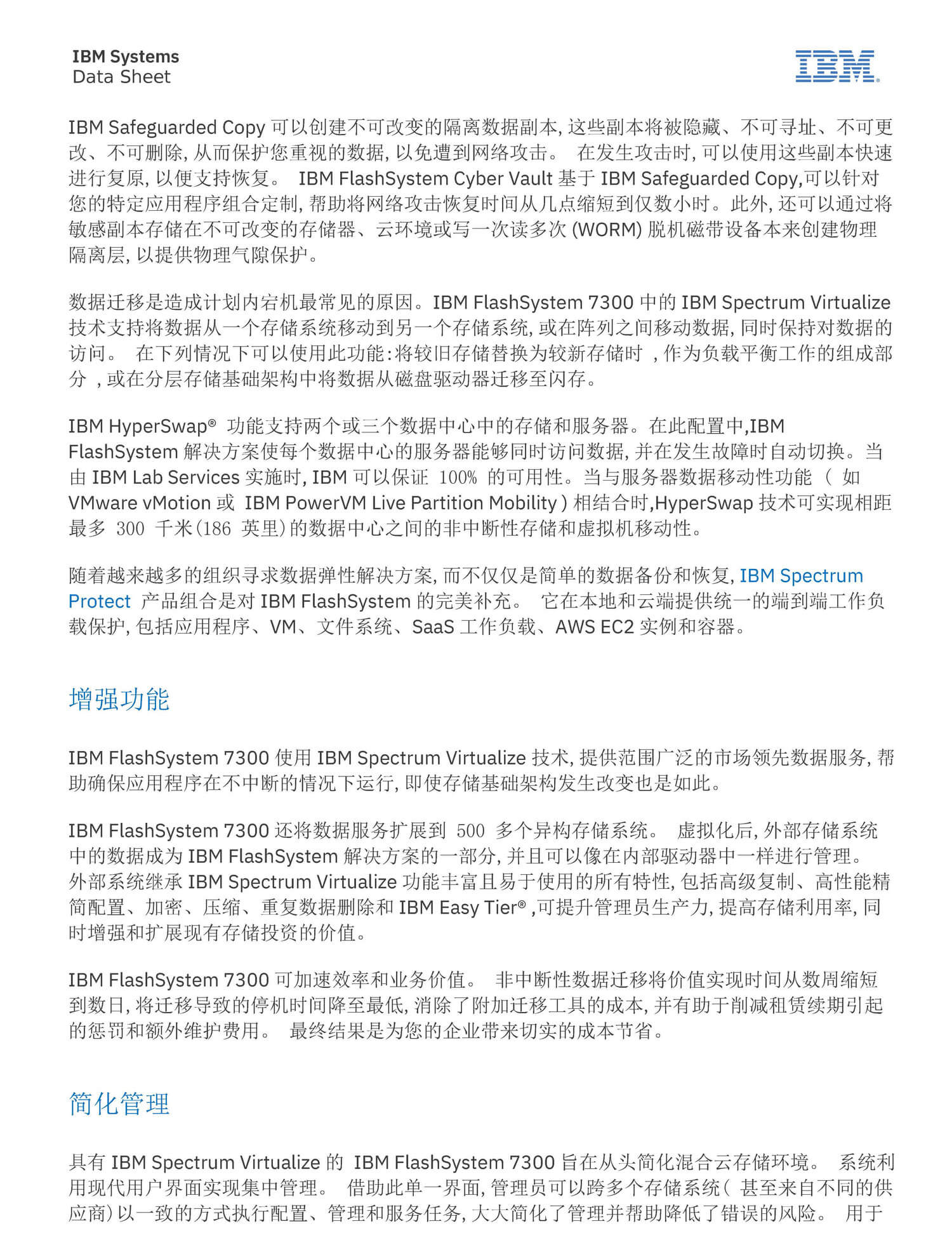 人工智能 (AI) 增强的应用程序、实时大数据分析和云架构需要 更高水平的系统性能和存储容量,为了利用这些技术,全球各地 的企业正在快速推进传统 IT 基础架构的现代化进程。 但对许 多组织而言,员工资源和专业知识不够丰富,并且成本效益是首 要的考量因素。 这些组织在其希望最大化的现有基础架构中进 行了大量投资。 他们需要企业级解决方案,在优化成本效益的 同时简化实现现代化的途径。IBM FlashSystem 7300 专为这 些需求和用例设计,可在不影响应用程序性能的情况下交付网络 弹性。