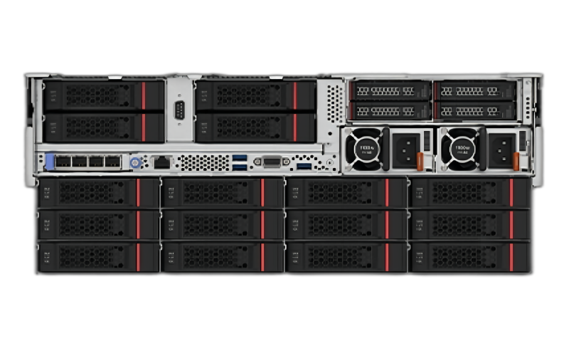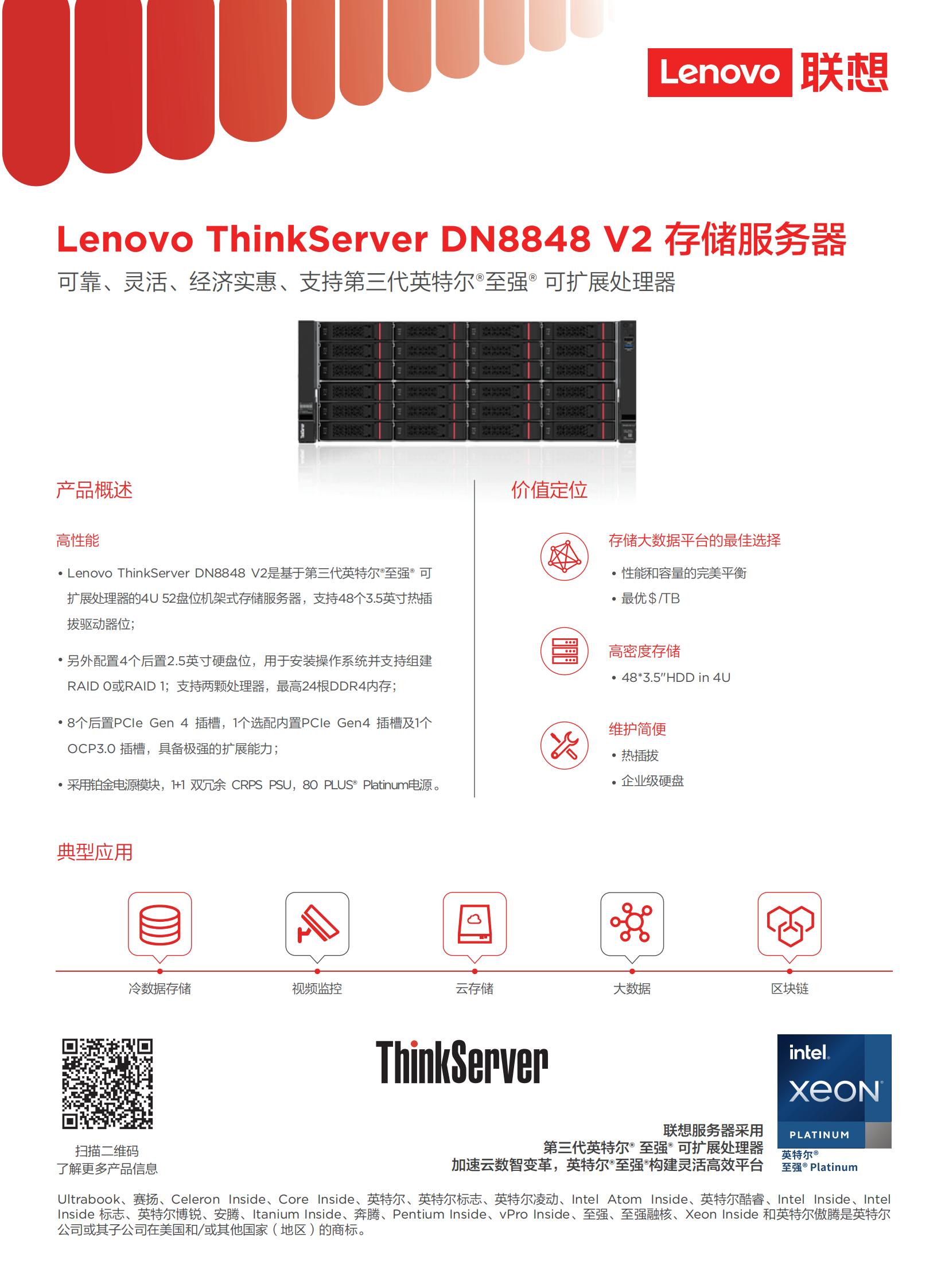 Lenovo ThinkServer DN8848 V2是基于第三代英特尔“至强" 可扩展处理器的4U 52盘位机架式存储服务器,支持48个3.5英寸热插拔驱动器位;