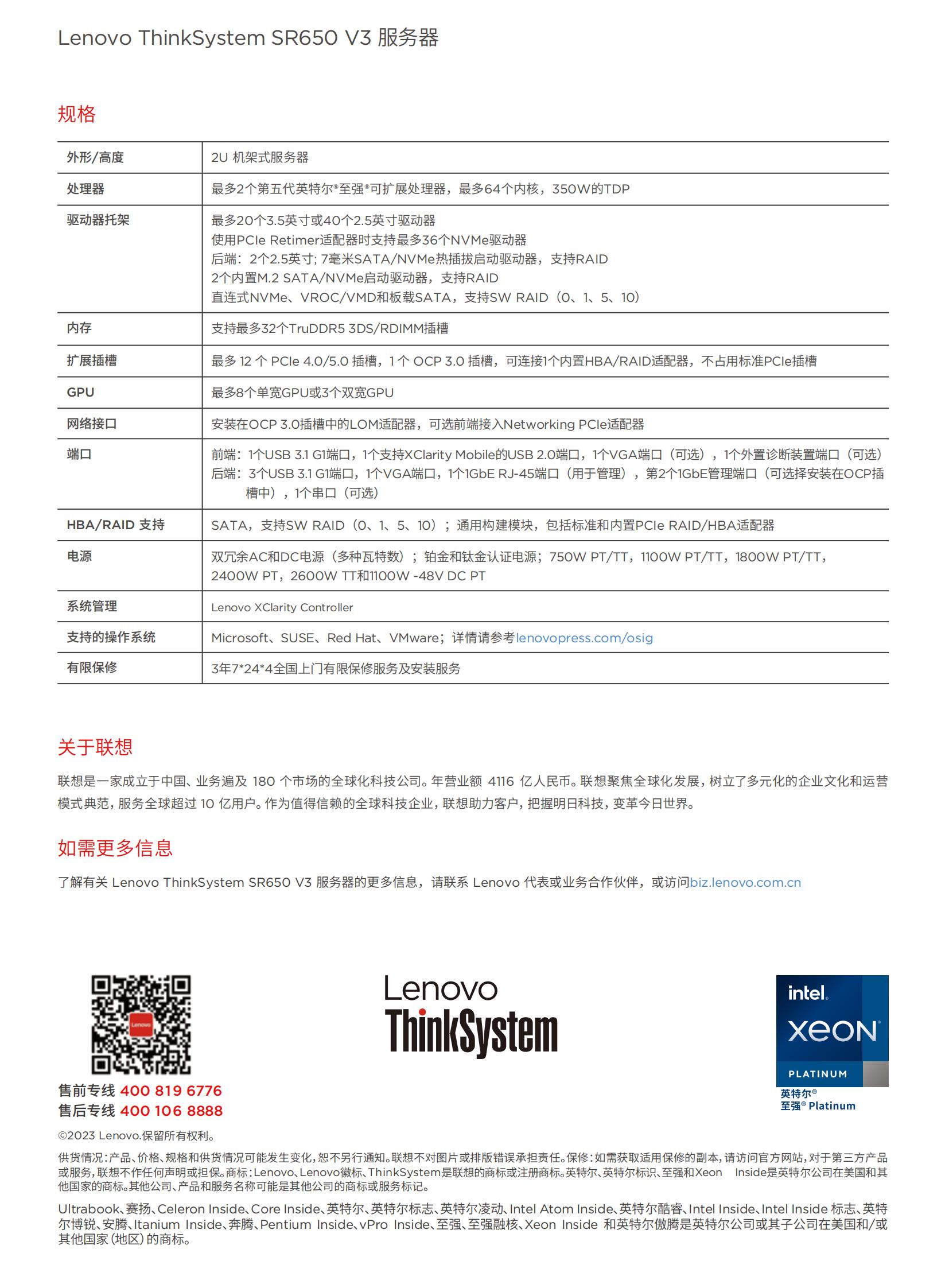 ThinkSystem SR650 V3具有支持当前的工作负载所需要的低延迟、大容量和出色性能。它通过热插拔驱动器提供灵活的存储选项,可以根据不断变化的需求轻松扩展。