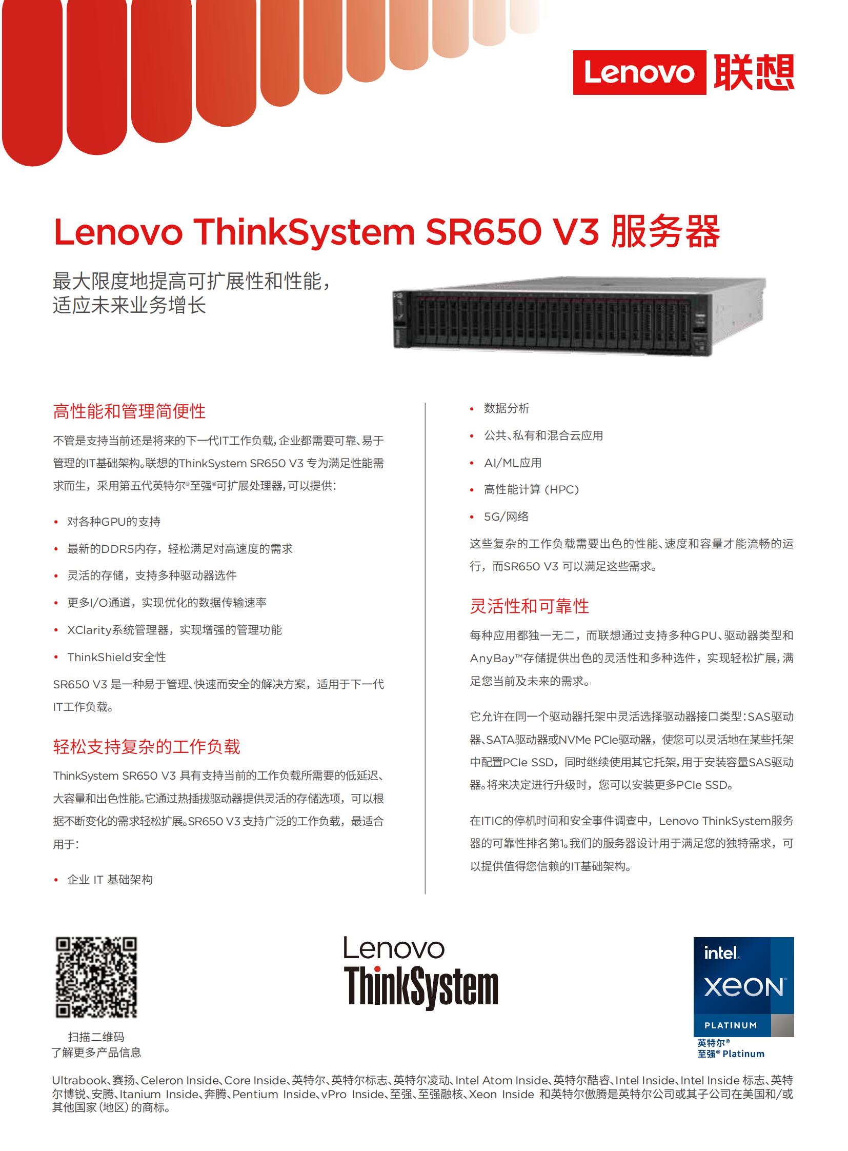 SR650 V3是一种易于管理、快速而安全的解决方案,适用于下一代IT工作负载。不管是支持当前还是将来的下一代IT工作负载,企业都需要可靠、易于管理的IT基础架构。联想的ThinkSystem SR650 V3专为满足性能需求而生,采用第五代英特尔®至强®可扩展处理器。